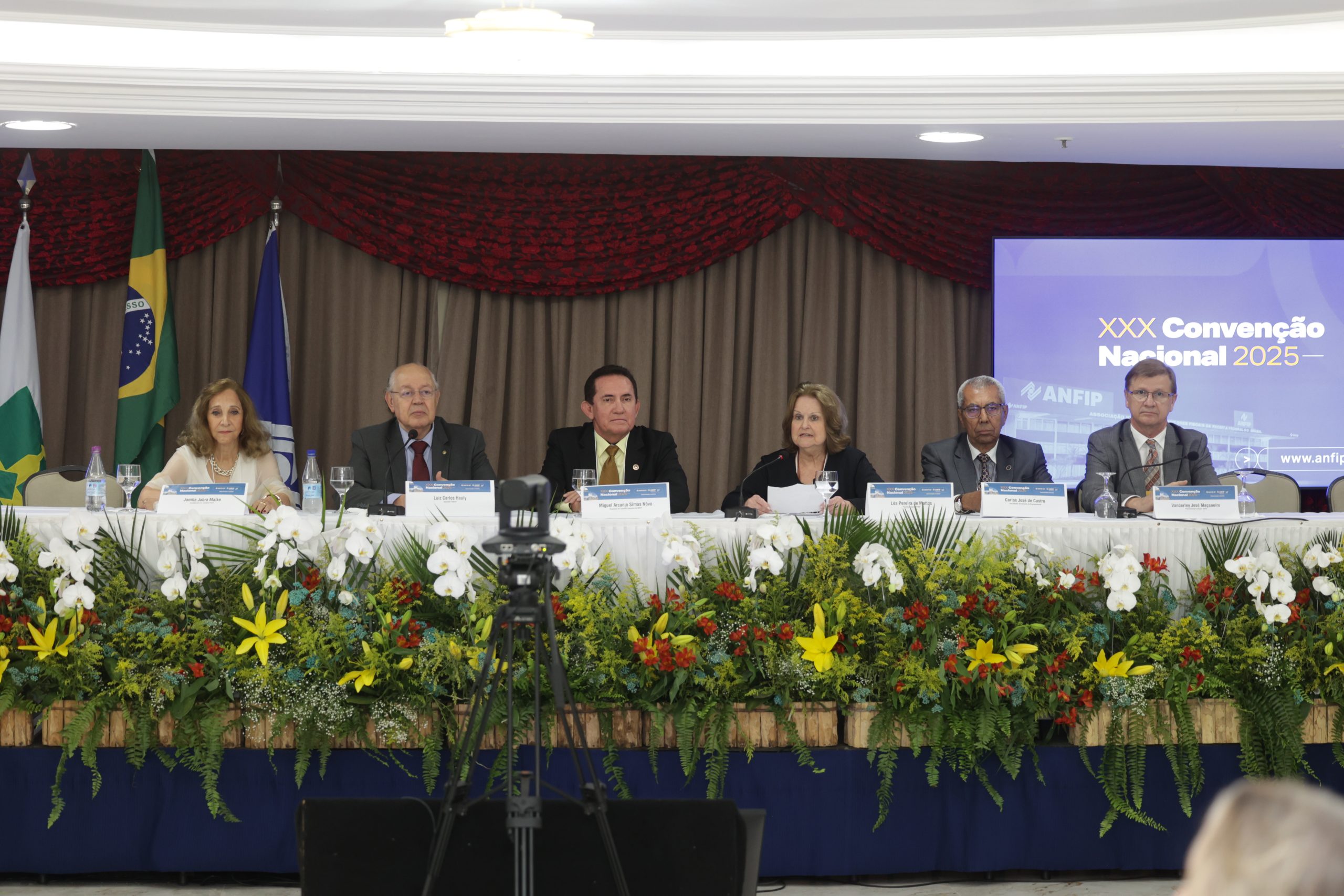 A mesa de honra reuniu o presidente nacional da ANFIP, Miguel Arcanjo Simas Nôvo; a presidente da ANFIP-DF, Léa Mattos; o coordenador do Conselho de Representantes, Carlos José de Castro; a coordenadora do Conselho Fiscal, Jamile Jabra Malke; o presidente da Fundação ANFIP, Vanderley José Maçaneiro; o presidente do Mosap, Edison Haubert; além dos deputados federais Luiz Carlos Hauly (Podemos/PR) e Érika Kokay (PT/DF).