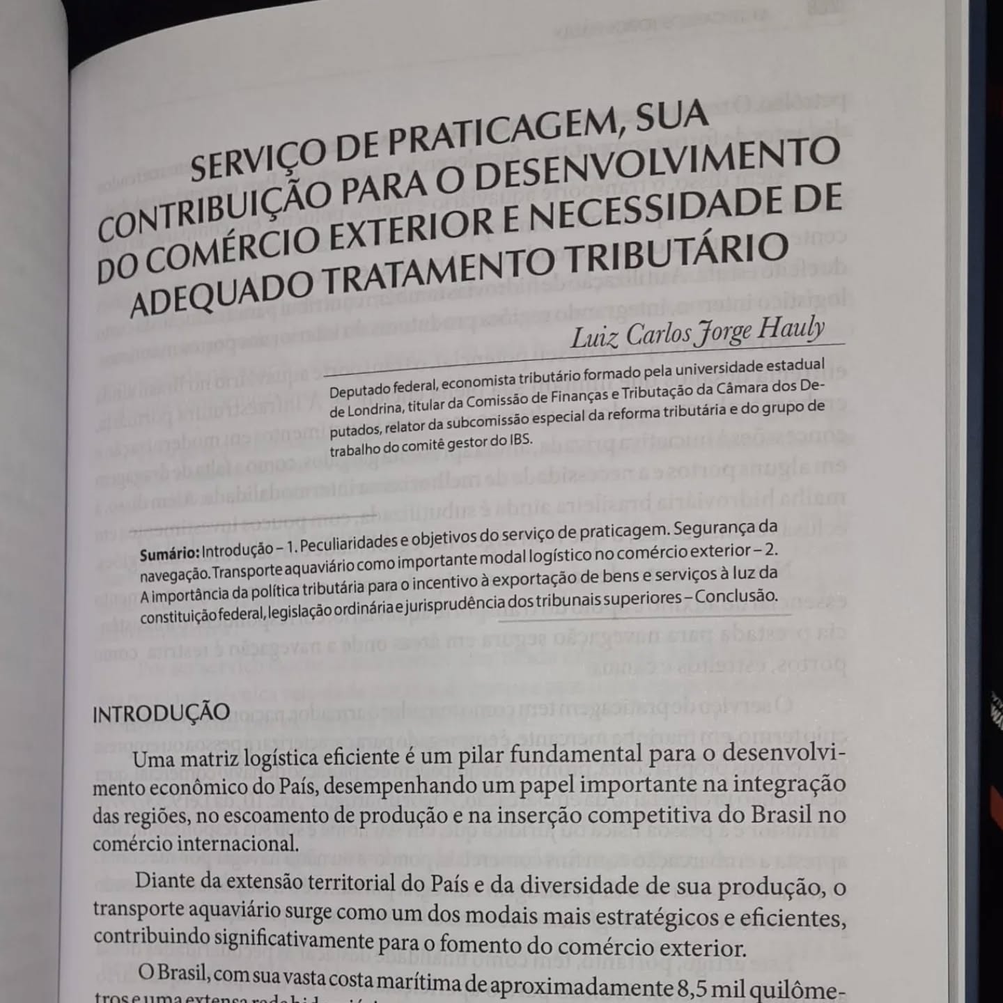 O parlamentar contribuiu com o artigo “O Serviço de Praticagem e sua Contribuição para o Desenvolvimento do Comércio Exterior e a Necessidade de Adequado Tratamento Tributário”, que aborda a relevância econômica e estratégica dessa atividade essencial à segurança e eficiência do transporte marítimo brasileiro.