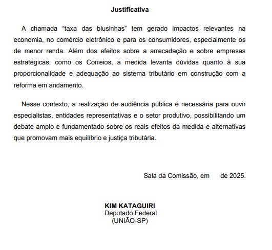 “A chamada taxa das blusinhas tem gerado impactos relevantes na economia, no comércio eletrônico e para os consumidores, especialmente os de menor renda. Além dos efeitos sobre a arrecadação e sobre empresas estratégicas, como os Correios, a medida levanta dúvidas quanto à sua proporcionalidade e adequação ao sistema tributário em construção com a reforma em andamento”, afirmou o deputado.
