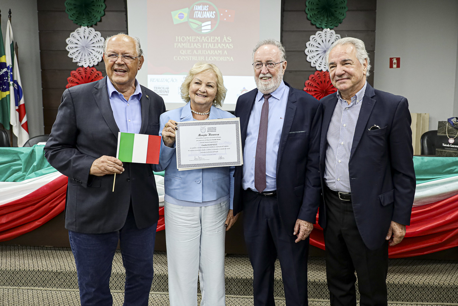 Mais de 500 pessoas participaram da "Homenagem às famílias italianas que contribuíram para o desenvolvimento de Londrina", uma iniciativa do deputado Tercilio Turini (MDB) para valorizar imigrantes e descendentes que chegaram até a década de 1960 e atuaram na consolidação da segunda maior cidade do estado. A cerimônia, realizada na sexta-feira (23) à noite, transformou-se em uma festa de reencontros e emoção. A Menção Honrosa da Assembleia Legislativa do Paraná destacou a importância dos homenageados com a mensagem: "Em gratidão e reconhecimento pelo trabalho na construção de Londrina. Os italianos trouxeram a alegria, a cultura, os costumes e a vontade de vencer. Um marco na história do Paraná."